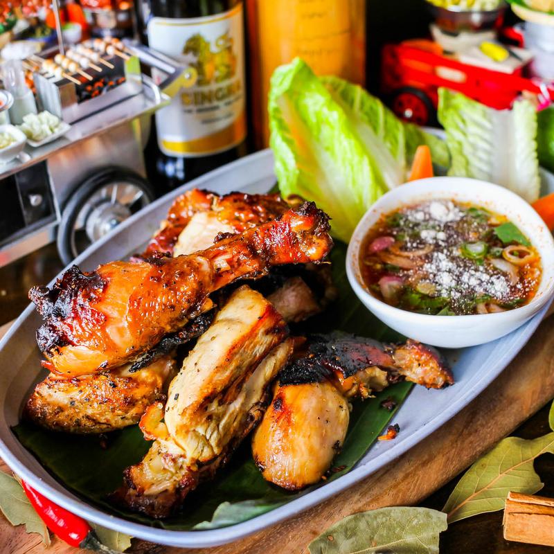 Lightly smoked, half-bird Springer Mountain Farms free-range chicken, marinated with lemongrass, garlic, pepper, and cilantro. Served with nam jim jeaw • Should eat with sticky rice | Contains: soy, gluten, fish sauce.