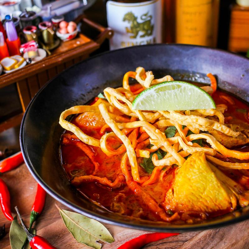 Northern Thai curry noodle soup made with chicken breast, and our complex dry spice mixture, tamarind, and roasted chili, served with shallots, pickled mustard greens, and lime • Chef Preeya’s Chiang Mai specialty | Contains: shellfish.