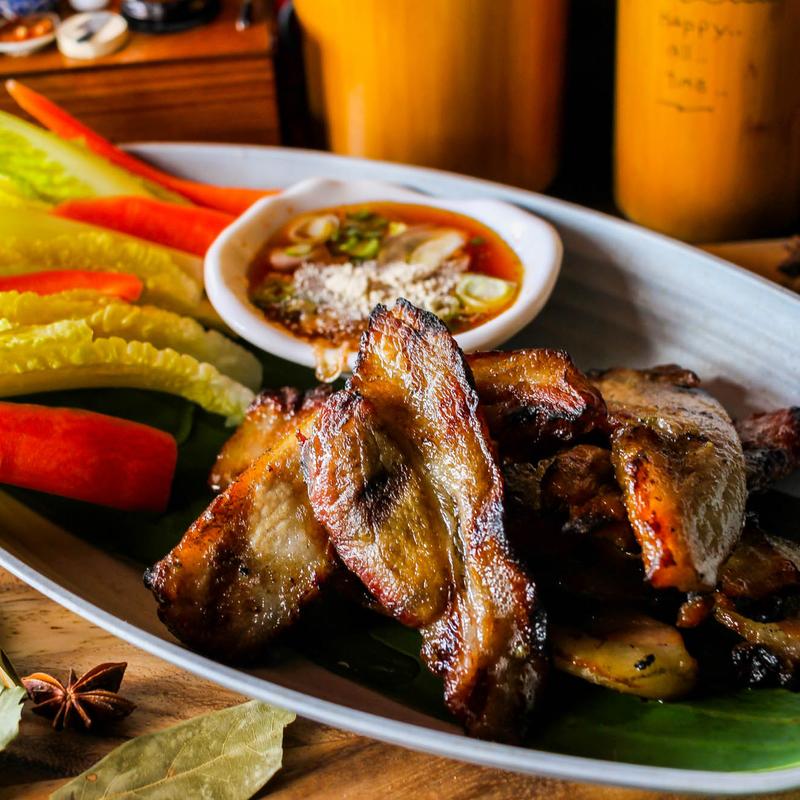 Riverview Farms Heritage Berkshire pork jowl seasoned and marinated with Thai herbs, lightly smoked, and served with nam jim jaew • Absolute favorite and should be eaten with sticky rice | Contains: soy, gluten, fish sauce, shellfish.